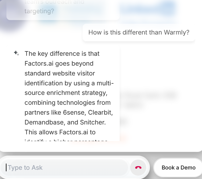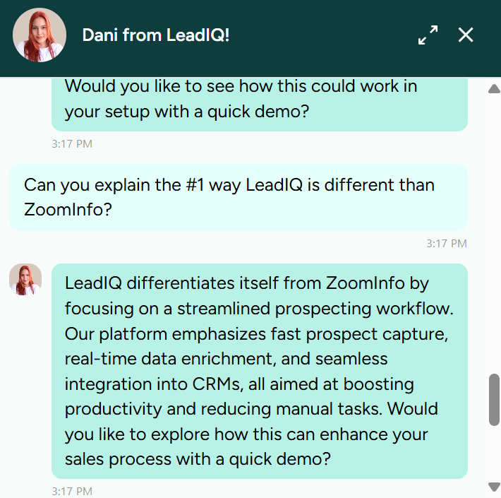 When I asked the Warmly bot to explain what’s the #1 difference between LeadIQ and ZoomInfo it gave me this response, telling me LeadIQ focused more on a streamlined prospecting workflow, emphasizing “Fast prospect capture, real-time data enrichment and seamless integration into CRMs”. A bit of a mouthful, I must admit, but that seemed mostly correct.