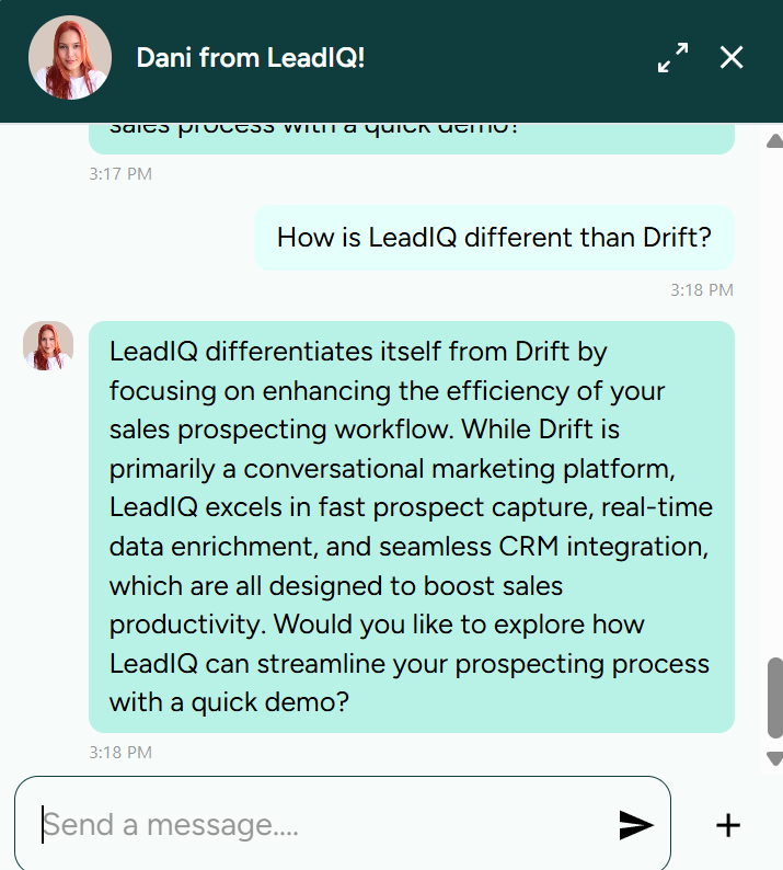I then tried to trip it up, by asking it what’s the difference between LeadIQ and Drift, and it correctly told me that Drift was a conversational AI tool, and LeadIQ wasn’t. I tried 🙂