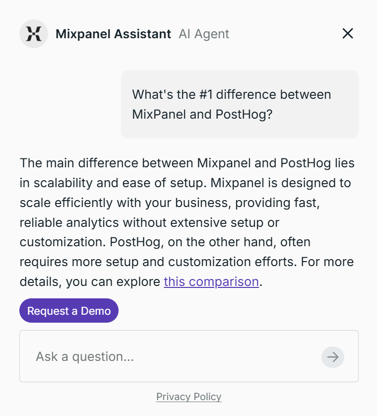 At the center of the product is Piper, their AI SDR Agent. I decided to give it a try by finding a customer of Qualified, MixPanel and asking it the question “What’s the #1 difference between Mixpanel and Posthog?” It gave a reasonable answer, along with a link to a comparison page.