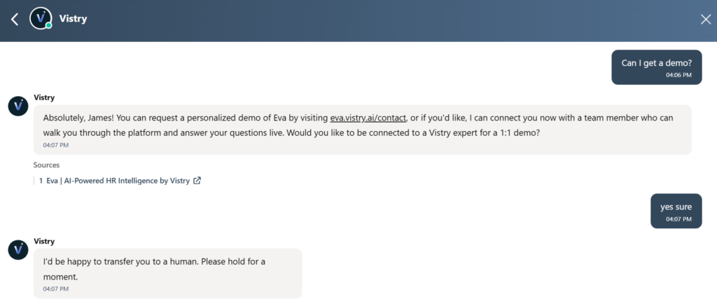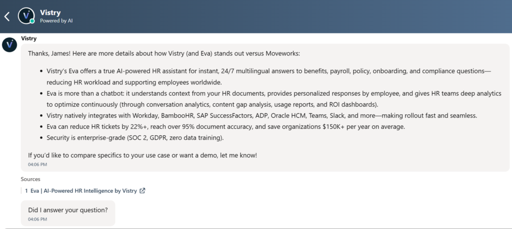 However, Hubspot Chat does have an AI mode, which is paid feature. I was able to test it by asking a bot in Vistry what the difference was between them and Moveworks, and it gave me a very detailed response, with a link for more details.