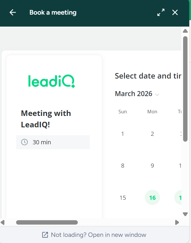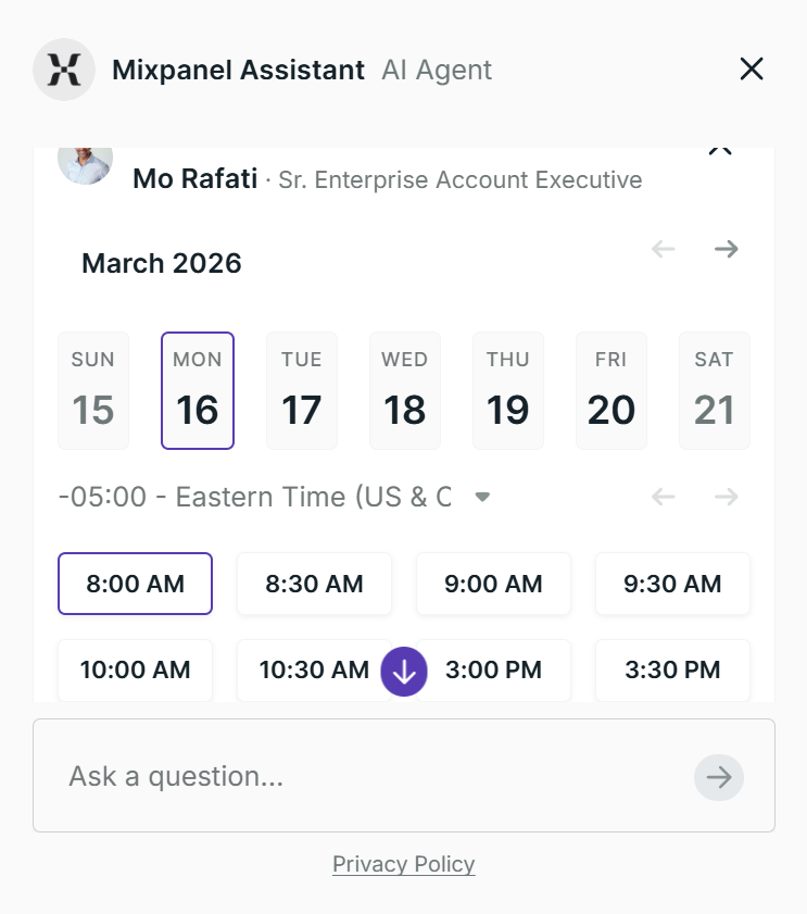 When I decided to book a meeting, the bot asked me a few qualifying questions, and then I was redirected to a screen showing me the account executive I was going to meet with, and an option to choose a date/time. Again, fairly straightforward and similar to Warmly.