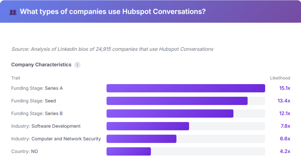 As expected, the types of companies that use Hubspot Chat are typically SMBs, and smaller startups, not enterprises.