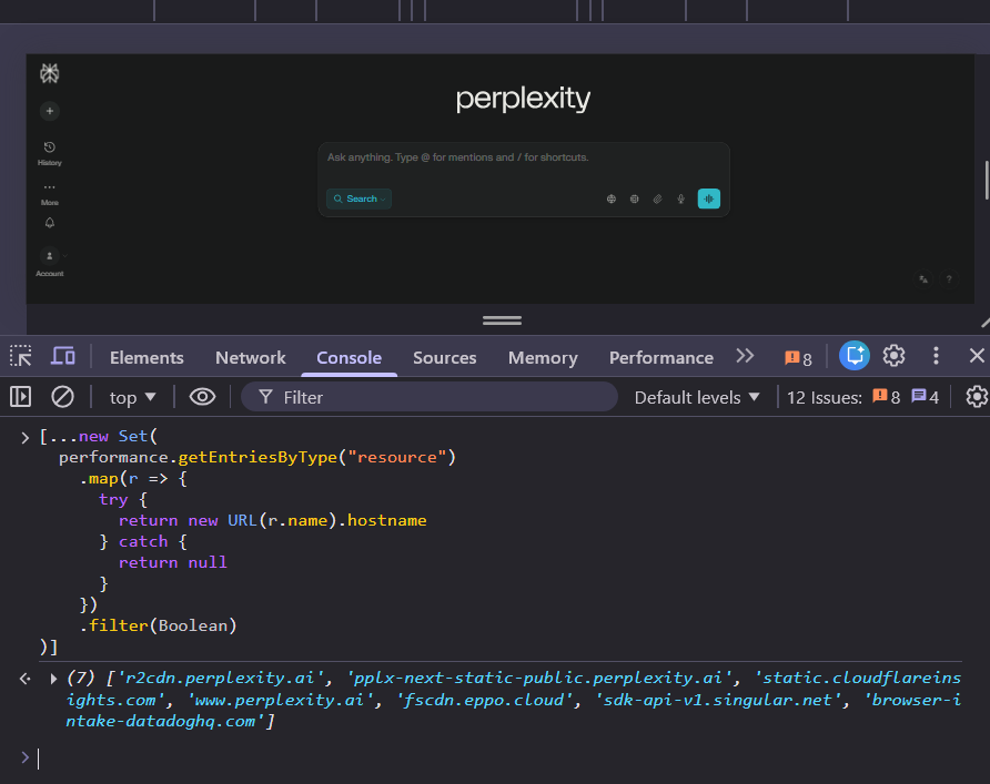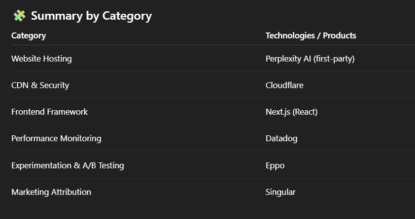 When I did this for perplexity.ai, I was able to found out Perplexity uses Cloudflare as a CDN, Next.js as their frontend framework, DataDog for observability, Eppo for A/B testing and experimentation, and Singular for marketing attribution.