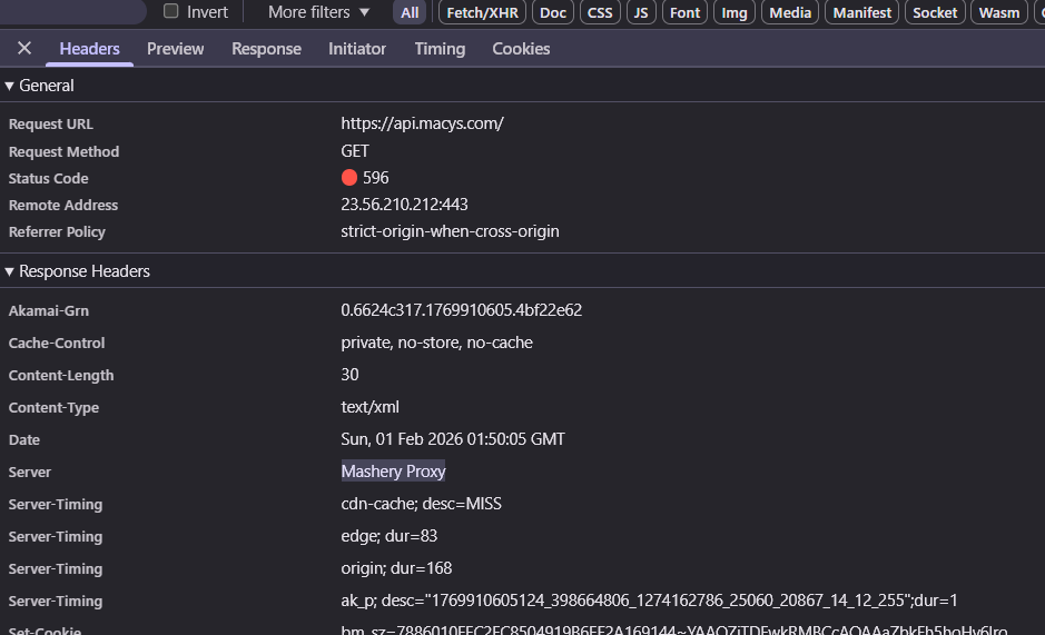 When I hit https://api.macys.com/, I get a 596 error. But look at the response headers: