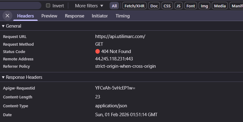 When I hit https://api.utilimarc.com/, I get a 404. But the response headers reveal: