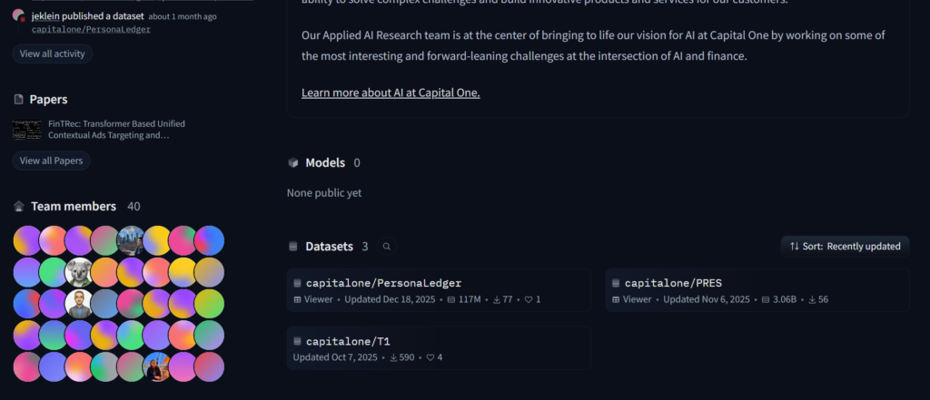 For example, when I browsed to CapitalOne’s Hugging Face profile, I could see that they have a fairly large machine learning team (over 40+ employees)
