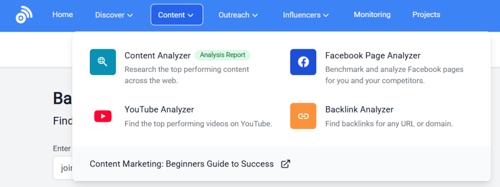After you sign up, open their Backlink Analyzer through “Content” > “Backlink Analyzer”.