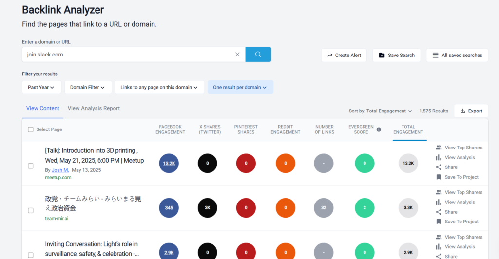 A backlink tool lets you reverse-engineer that. In this case, you’re asking: what websites link to join.slack.com? Every result is a site that’s publicly pointing people to a Slack community, almost always their own.