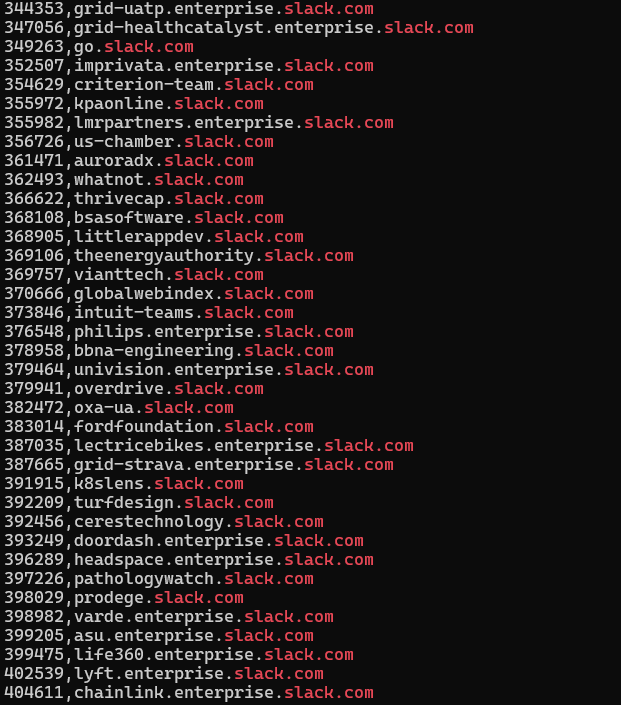 The Enterprise Grid entries are the real prize. philips.enterprise.slack.com, doordash.enterprise.slack.com, lyft.enterprise.slack.com. These are large companies that have committed to Slack at the organizational level, paying significant annual contracts. The company name is right there in the subdomain.
