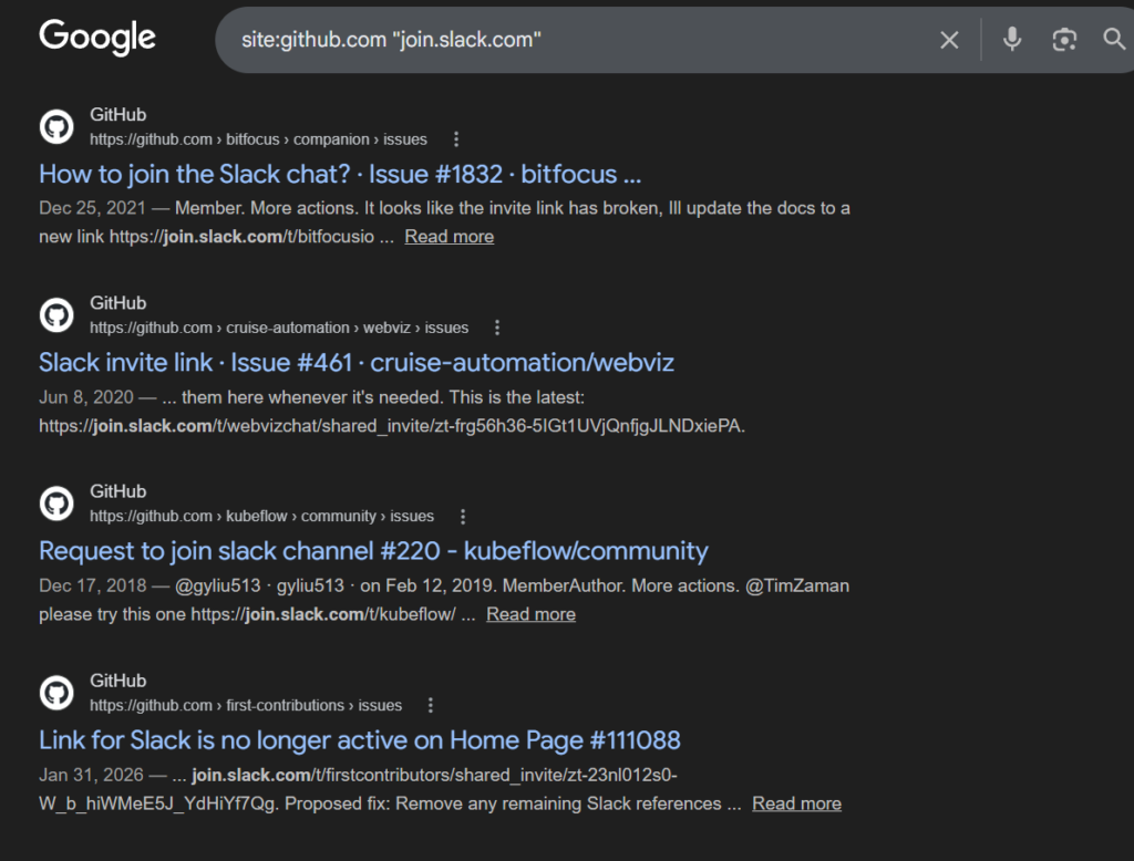 When those companies set up a Slack workspace, someone inevitably posts the invite link in the project’s GitHub repository, usually in a README file (the front page of a repo), an issue thread, or a community discussion.