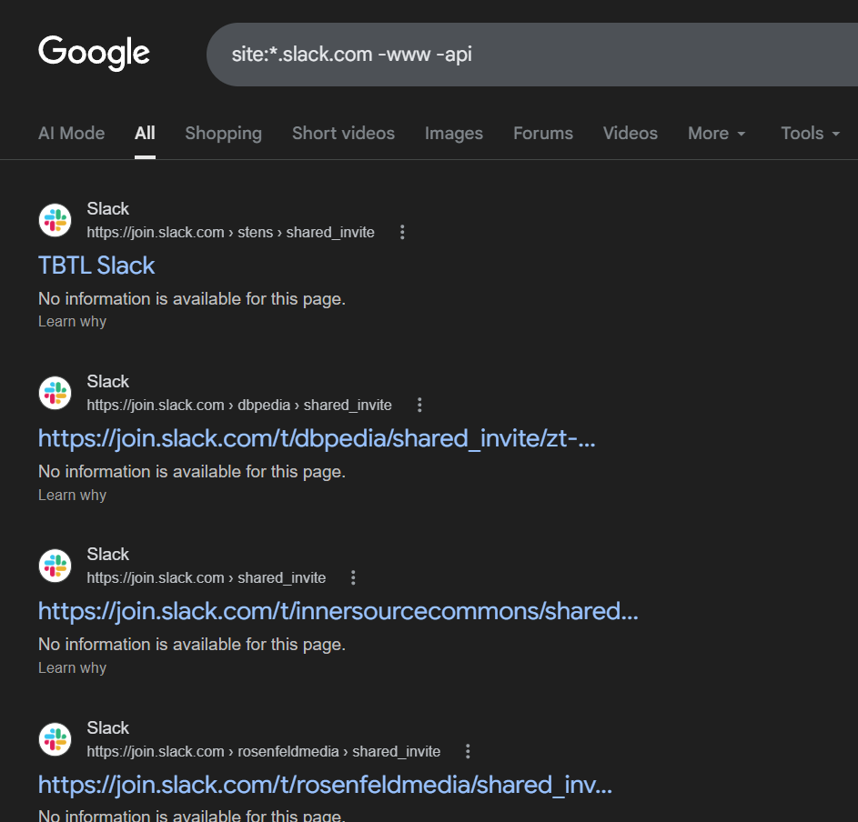 The site: part is a Google trick that limits results to a specific website. So this search says: “show me every page on slack.com that Google has indexed that doesn’t belong to www.slack.com or api.slack.com.” Each result is a public Slack workspace invite as shown below.