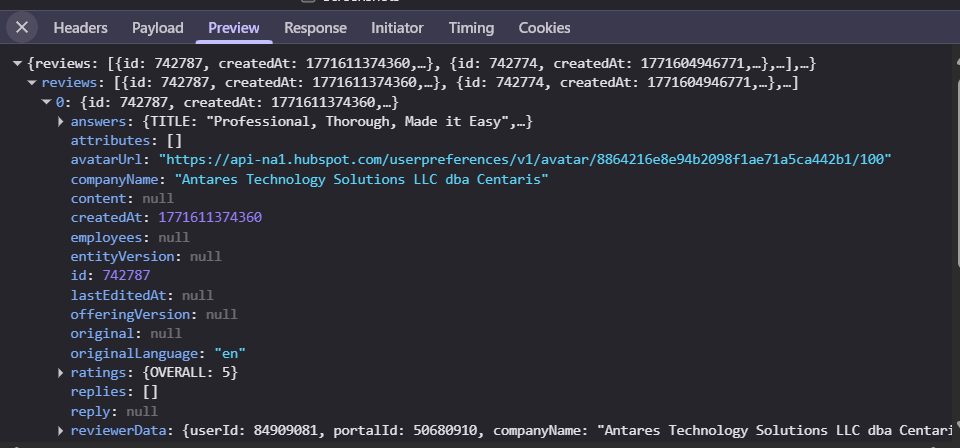Step 3: Look at the API requests. You’ll see calls to HubSpot’s API that return review data. The response includes fields like “companyName” that aren’t displayed in the UI.