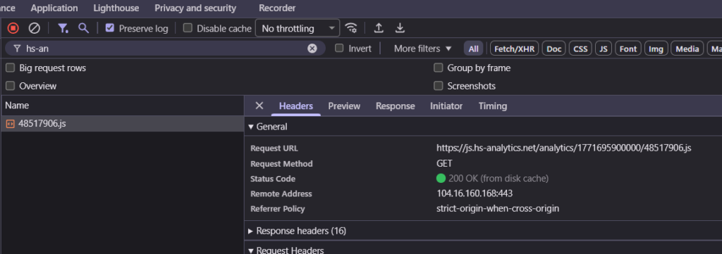 HubSpot tracking JavaScript: HubSpot injects tracking code on websites for analytics. The script domain is hs-analytics.net. You can detect this to confirm HubSpot usage.