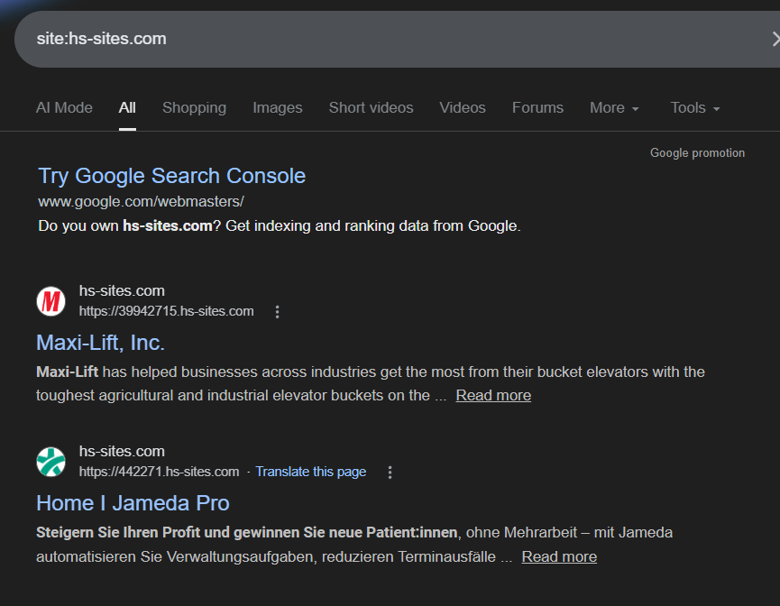 This returns thousands of results. Every public website hosted on HubSpot CMS. You’ll see URLs like 39942715.hs-sites.com or 442271.hs-sites.com.