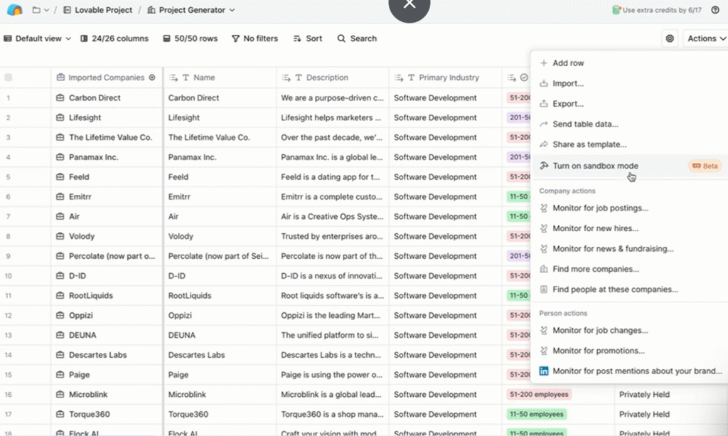 Sandbox mode creates a testing environment with a copy of your data (starts with your top 10 rows, max 50 rows). You can build out your entire workflow-adding enrichments, setting up waterfalls, configuring AI prompts-all while your production table stays locked and protected.