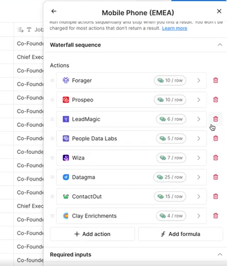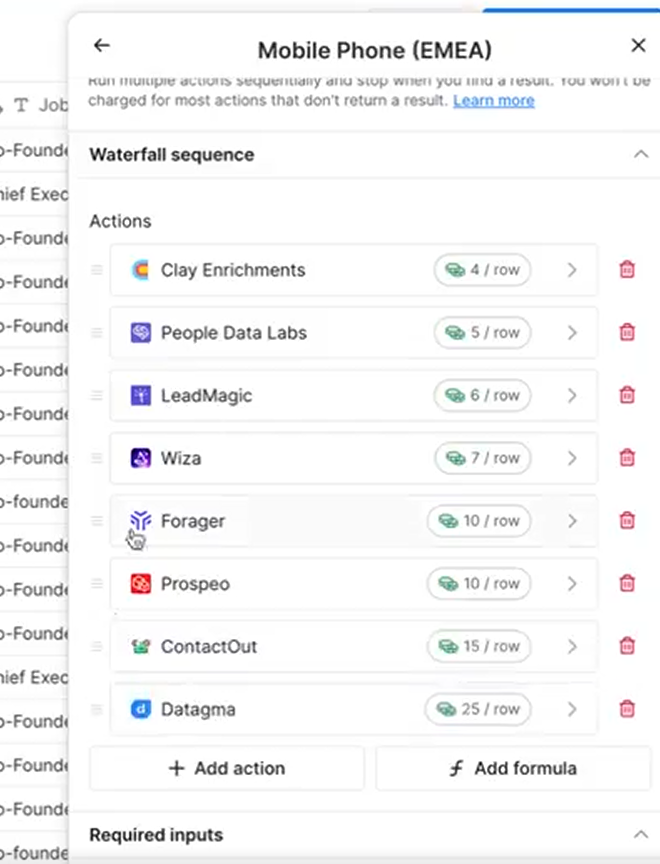 As an example, here’s the default order for mobile phone enrichments. As you can see, it has Forager and Prospeo listed in the first 2. Both of them consume 10 credits.