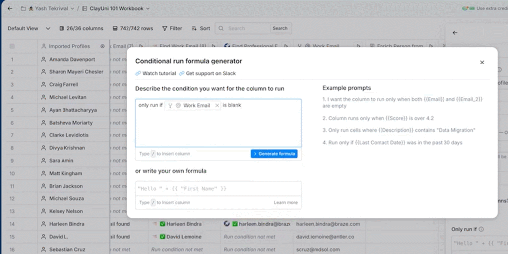 You’ll then see a screen pop-up where you can specify the conditional formula that must be true for the enrichment to run. Here, you can see I told Clay to only run this enrichment if “Work email” is blank.