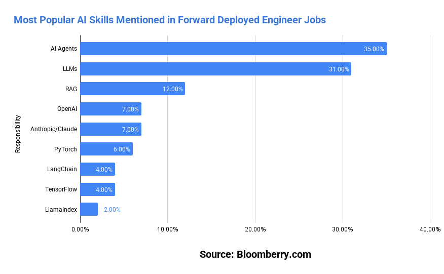 5. 35% of FDE jobs mention AI agents, 31% require LLM experience