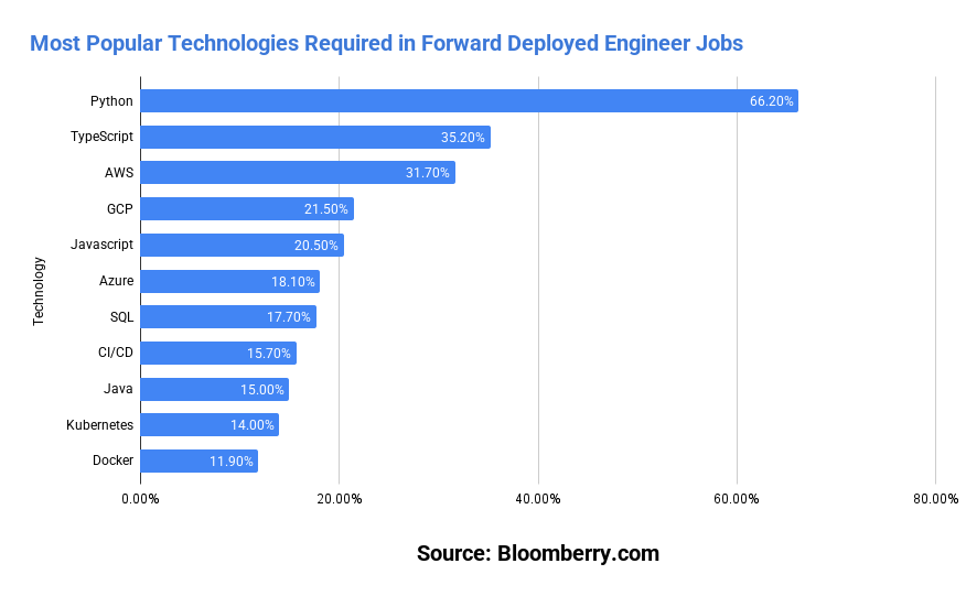 Among the top 10 technologies mentioned in forward deployed engineer jobs, Python dominates at 66% of job postings. That’s not surprising.
