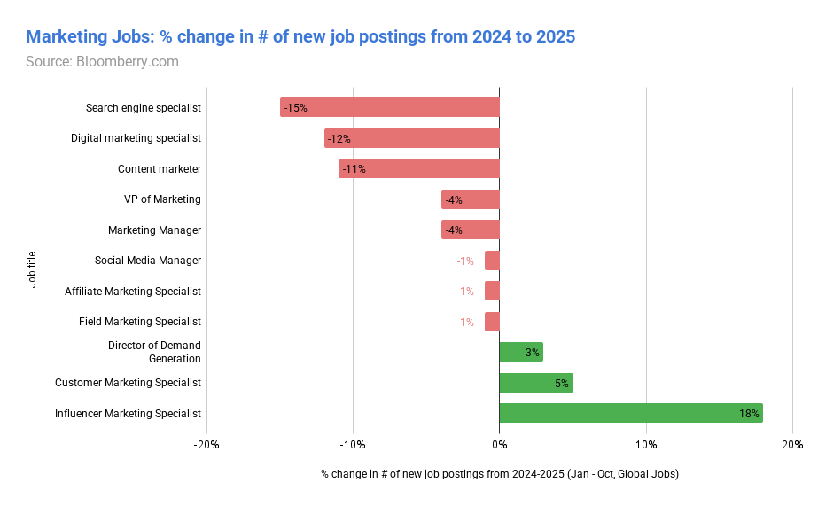 “Digital marketing jobs have been in a tough spot for a couple years now, with SEO, content, and social being particularly hard hit thanks to the rise of Zero Click Everything (i.e. search engines and social networks substantially curtailing the amount of traffic they send out). One of the few bright spots in all of this has been the rise of Zero Click Marketing (aka influencing people where they pay attention without necessarily trying to draw direct traffic). Little wonder that creator/influencer marketing specialists are one of the few categories that embrace this and are still growing.”