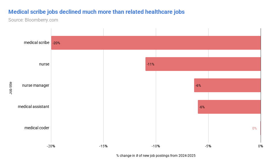 The obvious culprit might be AI documentation tools which can now listen to patient conversations and automatically generate clinical notes. Medical scribes do valuable work, but it’s the kind of structured documentation task that AI has gotten better at.