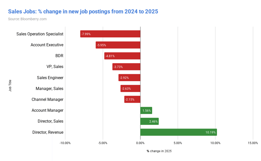 The 10.2% jump in Director of Revenue roles stands out as the only sales position showing significant growth. This role is relatively new – it didn’t really exist a decade ago – and represents a shift in how companies think about growth.