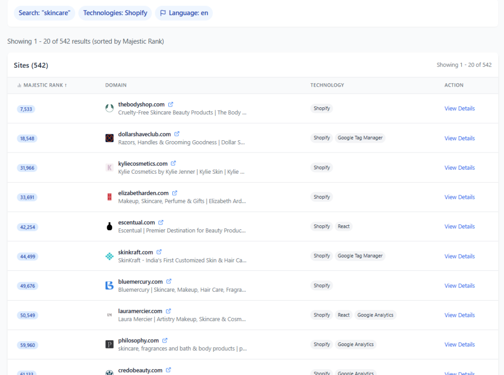 What sets TechPeeker apart is its keyword filtering. You can search for sites that contain specific terms in their title or meta description, which makes it easy to zero in on a niche. I tried searching for Shopify stores with “skincare” in their metadata, and the results were spot-on — a clean list of ecommerce sites selling skincare products. If you’re prospecting within a specific vertical, this feature alone could save you hours of manual filtering.