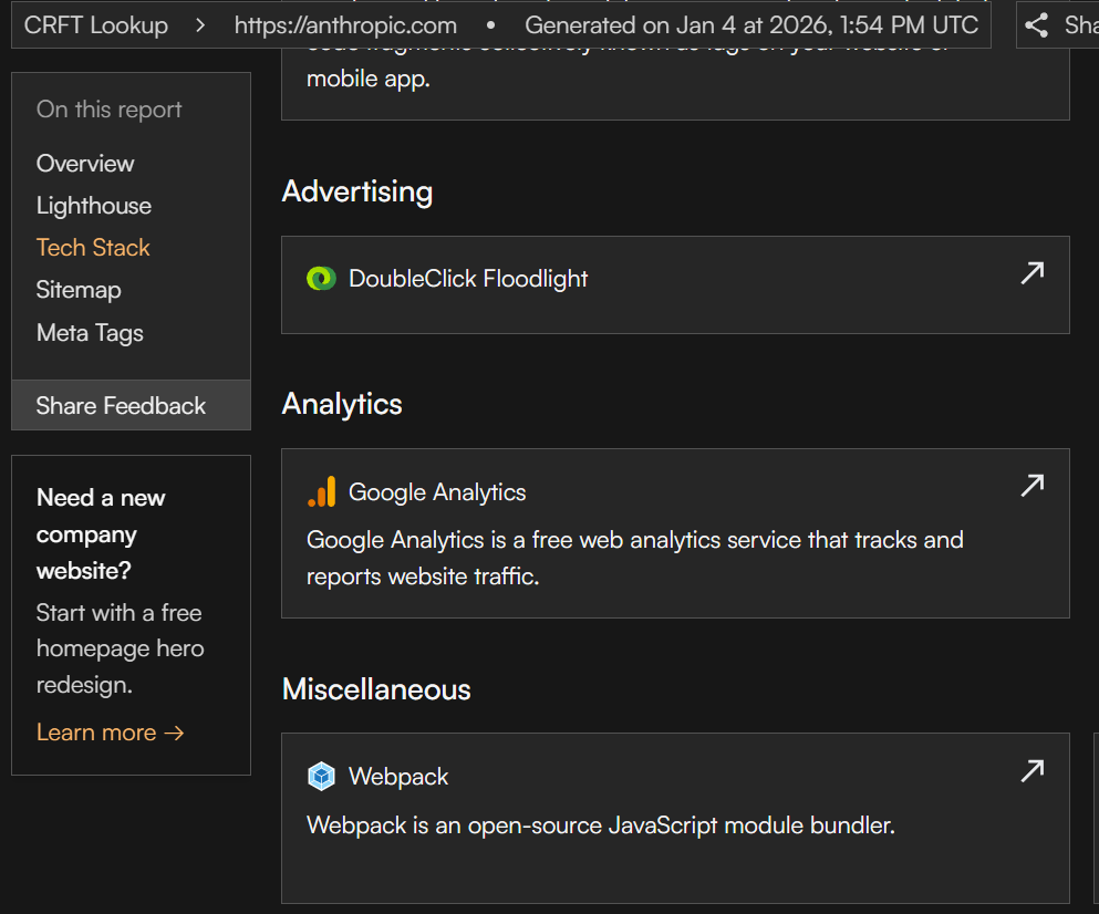 When I looked up the tech stack of Anthropic for instance, CRFT gave me a solid list of all the products and Javascript frameworks that Anthropic uses. Their coverage was pretty solid, as it gave me 16 technologies, compared to 17 from Wappalyzer. As you can see below, it did a good job of detecting Javascript frameworks in particular, as it showed that Anthropic was using Webpack, LottieFiles, and JQuery.