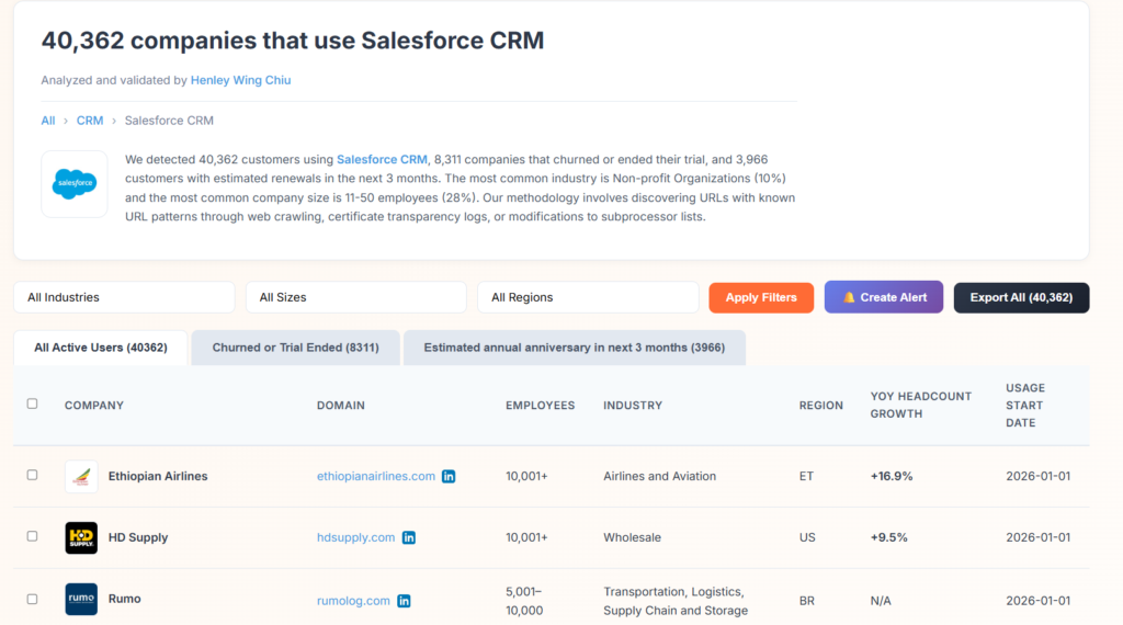 The problem with that? You’re not actually finding Salesforce CRM users – you’re finding companies that happen to use some Salesforce-adjacent tool on their website. That’s a very different audience. If you’re selling a Salesforce integration or a competing CRM, the Wappalyzer list won’t get you where you need to go.