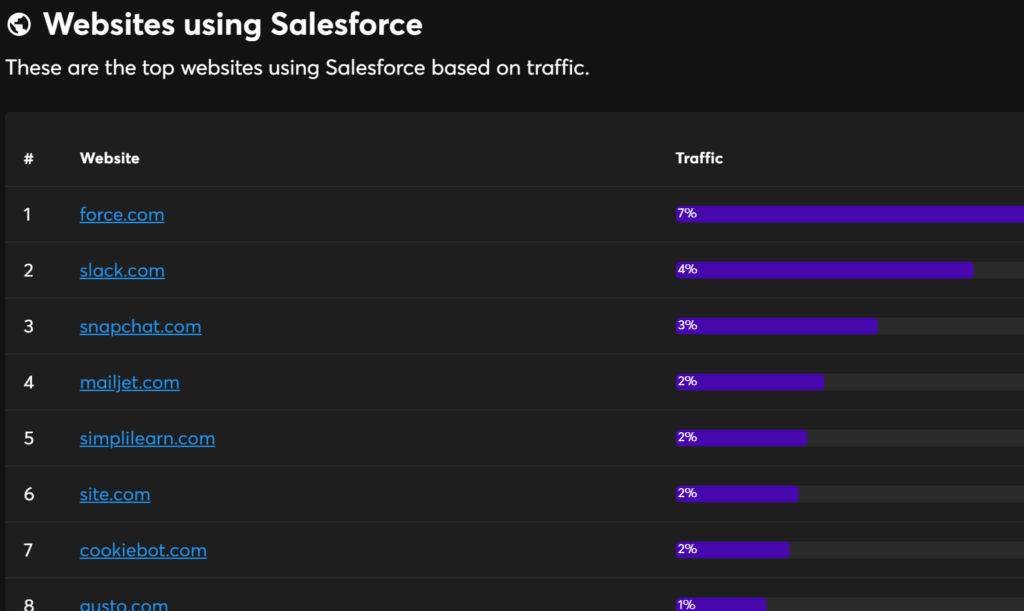 Wappalyzer, on the other hand is only able to detect companies that shows any visible footprint of using Salesforce on their website. This could be anything from using a Salesforce chat or customer service widget (Salesforce Service Cloud), or an analytics tracking script (ie Pardot).