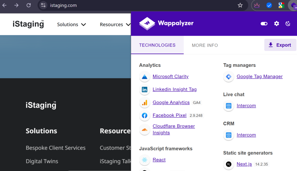Lastly, while Wappalyzer is a bit more accurate than BuiltWith, it still is inaccurate in the way it detects whether a technology was dropped by a website. As an example, Wappalyzer mistakenly showed Intercom as a technology present for the website istaging.com, as shown below.