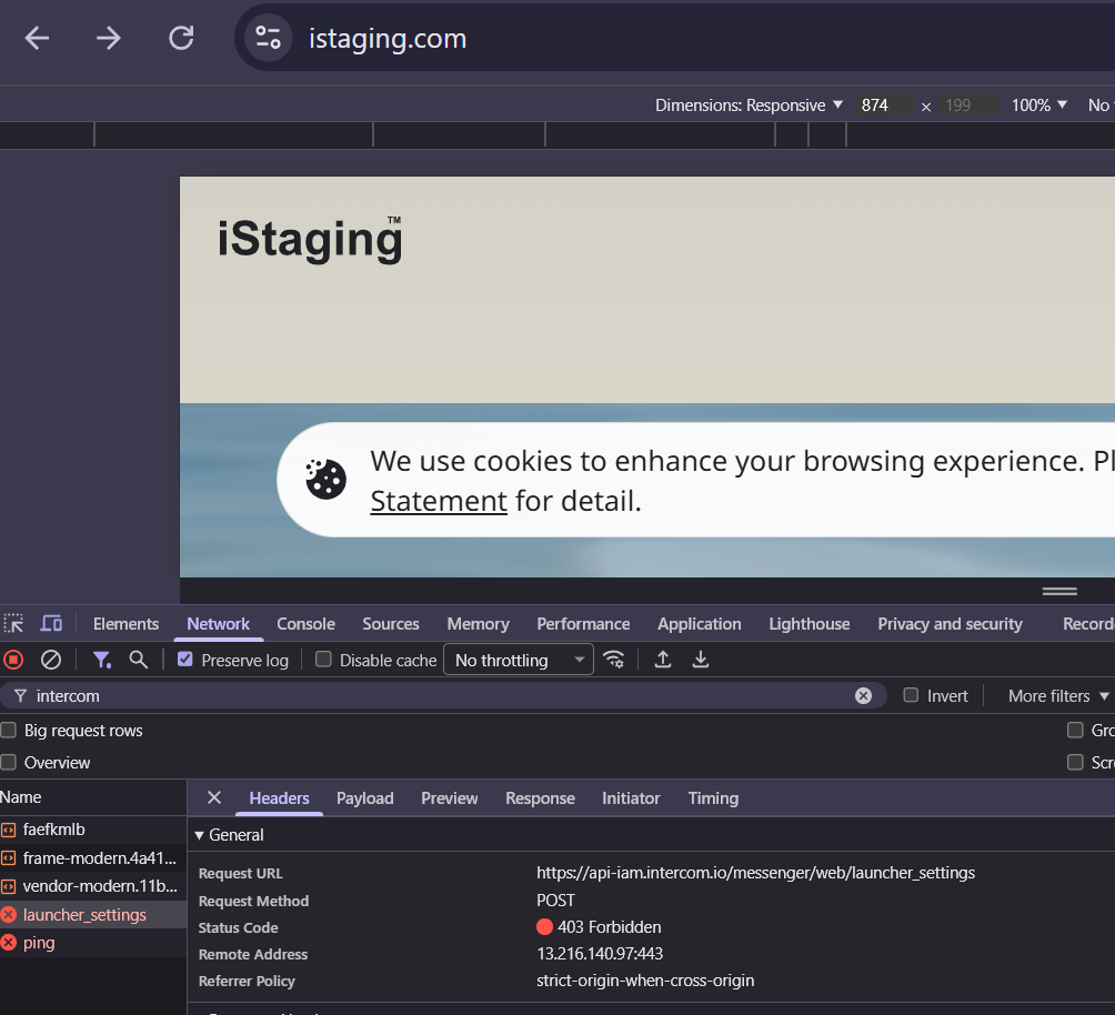 However, if you fire up a Javascript console and go to the Network tab, you’ll see that the Intercom app was suspended (it returned a 403: Forbidden response), and that the website actually stopped using Intercom. Wappalyzer detected the presence of the Intercom javascript and mistakenly assumed they were still using Intercom – something a lot of these tools get wrong (hence why they sometimes so inflated counts of websites using a particular technology).