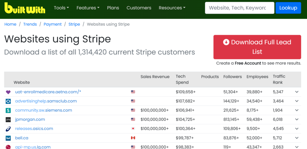 Here’s a good example that illustrates this difference. Let’s say you’re interested in knowing which companies are using Stripe (the payment processor). Wappalyzer currently shows 300,000+ websites using Stripe, while BuiltWith shows more than 1,3000,000 websites using Stripe.
