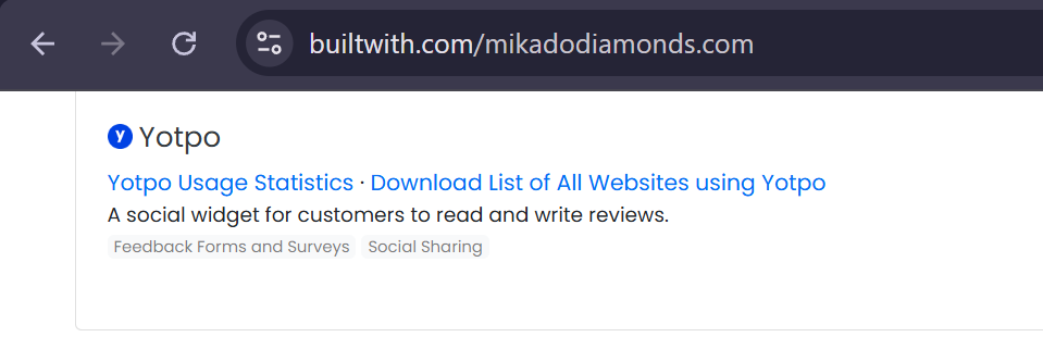 The tradeoff? BuiltWith’s data can lag behind reality. Some of those 1.3 million sites may have switched away from Stripe weeks ago, but BuiltWith’s crawlers haven’t caught up yet. Here’s an example of a site that removed Yotpo, a loyalty management tool on December 1, 2025 (It’s January 2 today), yet BuiltWith still claims that they’re using they’re using it.