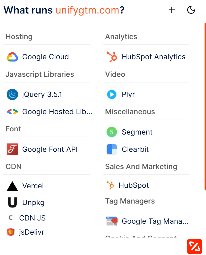 Like Wappalyzer, you simply visit a website, click the extension icon, and it displays the detected technologies. When I visited unifygtm.com, for example, it shows me the screenshot below.