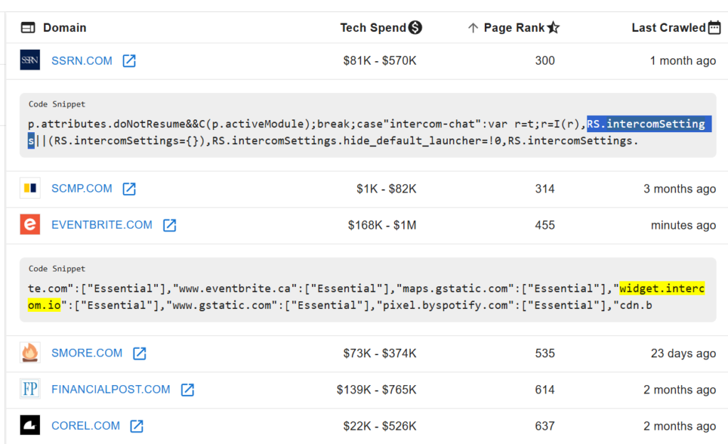 For example, when I searched for companies using Intercom, they seemed to do some sort of regular expression matching, looking for companies that have “intercomSetting” somewhere in their HTML source. This gave results like SSRN.com, which showed no signs of having Intercom installed anywhere.