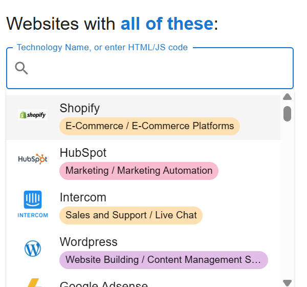 CRFT Lookup, like Wappalyzer also has no coverage of backend/backoffice products that aren’t detectable through the frontend. They also do not have any functionality related to lead generation. For instance, there’s no way to get a list of websites that use a particular Javascript framework.