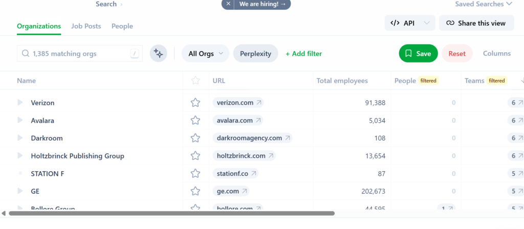 I searched for companies that mentioned Perplexity, and Sumber… err, Sumble (see what I mean?) returned a table of results of companies that all mentioned “Perplexity” in at least 1 job posting.
