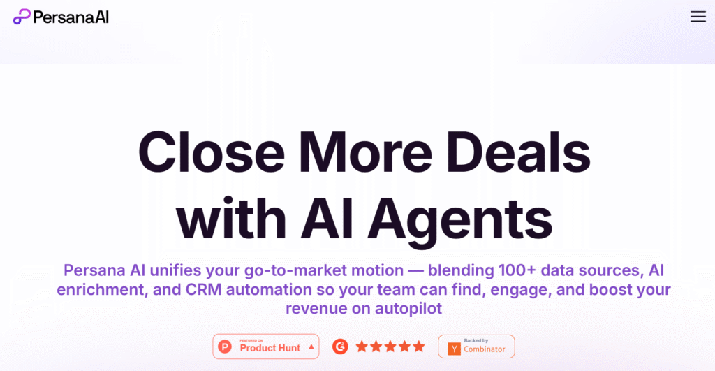 And right below it: “Persana AI unifies your go-to-market motion – blending 100+ data sources, AI enrichment, and CRM automation so your team can find, engage, and boost your revenue on autopilot.”