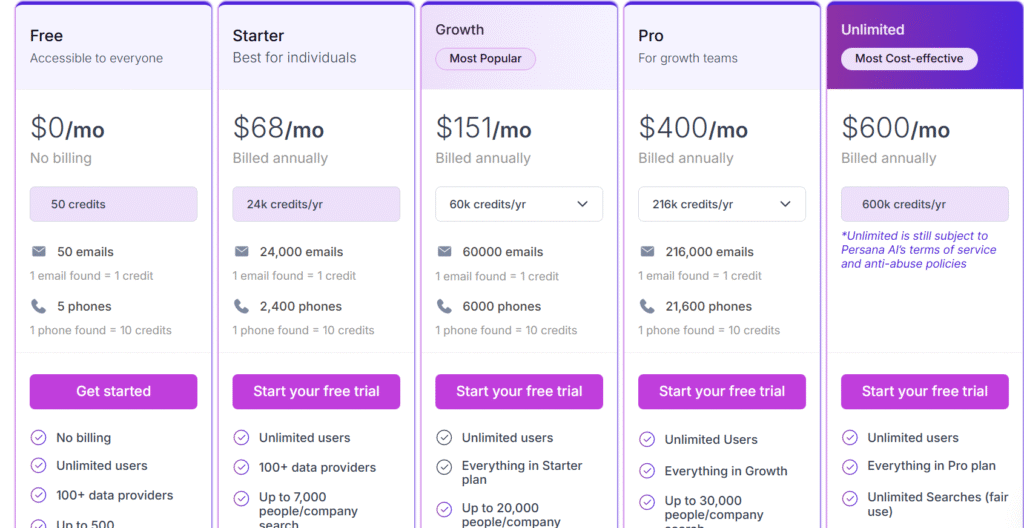 Persana uses a credit-based pricing model where 1 email = 1 credit and 1 phone number = 10 credits. They offer both monthly and annual billing, with a 20% discount if you pay annually.