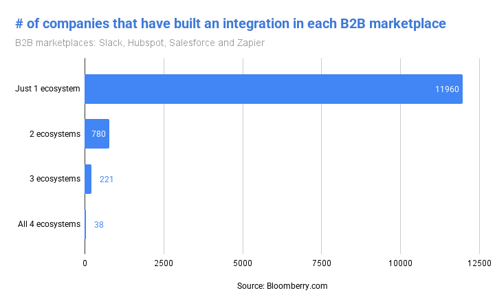 First off, of the 13,000+ companies that have made the commitment to build for a B2B ecosystem, 92% have done it in exactly one place. Only 6% have built for two ecosystems. Just 1.7% for three.