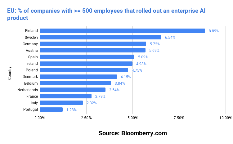 France (3.17%), Italy (2.75%), and Portugal (1.2%) clustering at the bottom is harder to explain cleanly. One theory: these are larger Southern European economies with more traditional corporate cultures and stronger labor protections that make workforce transformation politically sensitive. France in particular has powerful unions and strict employment laws – deploying AI tools that might displace white-collar workers is a more fraught decision than in Finland or Switzerland.