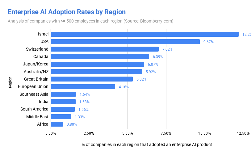 Enterprise AI adoption reveals a stark geographic reality: adoption rates range from 12.2% in Israel to 1.35% in the Middle East, among large companies worldwide.