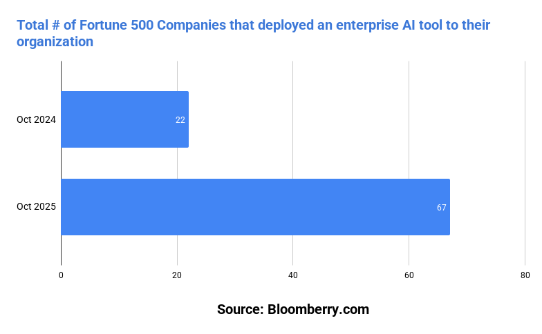 As of October 2025, 67 Fortune 500 companies now have deployed an enterprise LLM product (13.4% of the Fortune 500) to their employees. A more than 3x increase from a year ago.