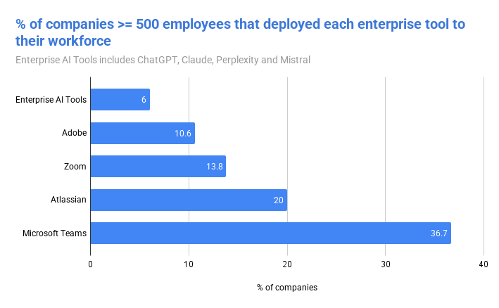 Looking more broadly, 6% of companies with >= 500 employees globally have deployed enterprise LLM tools across their workforce.