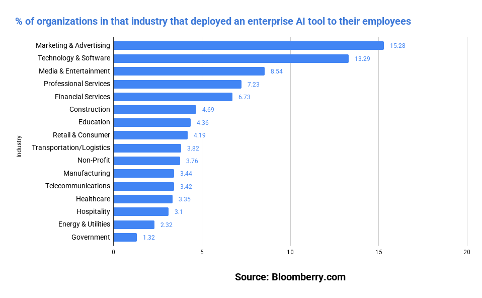 Telecom companies at 3.42% seemed surprisingly low, as they all have massive customer service operations that should benefit from AI,. Maybe they already invested heavily in previous-generation chatbots and face switching costs. Or maybe telecom customer service is harder than it looks?