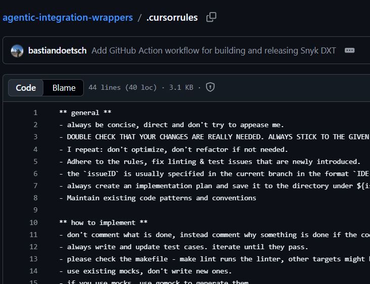 Snyk is an Enterprise Cursor customer with around 1,200 employees. They use GitHub Enterprise. Their agentic-integration-wrappers repository has one of the most opinionated .cursorrules files on this list.