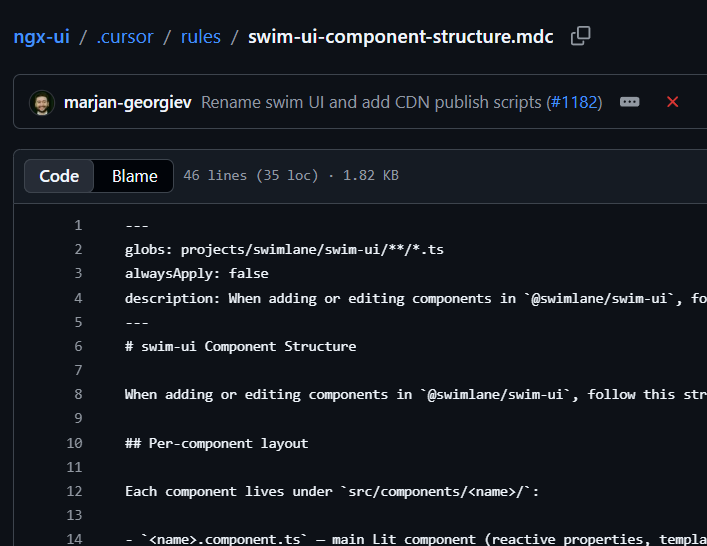 Swimlane is an Enterprise Cursor customer with around 250 employees, roughly 75 in engineering. They also use ChatGPT, Claude, GitHub Enterprise, and Vercel Pro. Their ngx-ui repository has two Cursor rules tied to their ongoing migration from their Angular component library to a new Lit web component library.