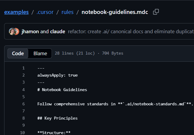 The rule enforces notebook quality standards: markdown intro at the top, all imports in the first cell, all dependencies pinned to exact versions, explain the "why" before code, cleanup cells at the end if the notebook creates resources. The non-negotiable: every notebook must run cleanly with "Restart Kernel and Run All." No hardcoded secrets. It's a simple rule, but for a small team maintaining a large public examples repo, having it apply automatically to every file means they don't have to think about it.