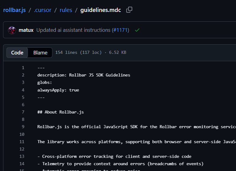 Rollbar is an Enterprise Cursor customer, a team of around 35 people. They also use Claude Code. Their rollbar.js repository has a single Cursor rule that applies to all files and essentially serves as an onboarding guide to the SDK for Cursor.